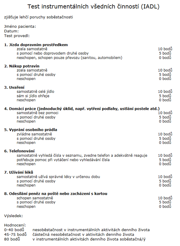 Chcete-li nám pomoci zrychlit vypisování zmíněného dotazníku, doporučujeme především při žádosti o příspěvek na péči vytisknout a zakroužkovat dva níže uvedené dokumenty (ADL i IADL) a přinést nám je.
